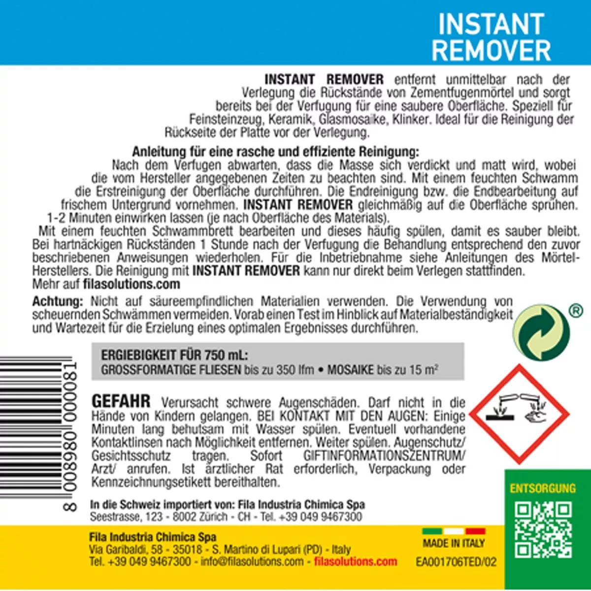 Fila INSTANT REMOVER čistič na cementovou maltu 750 ML