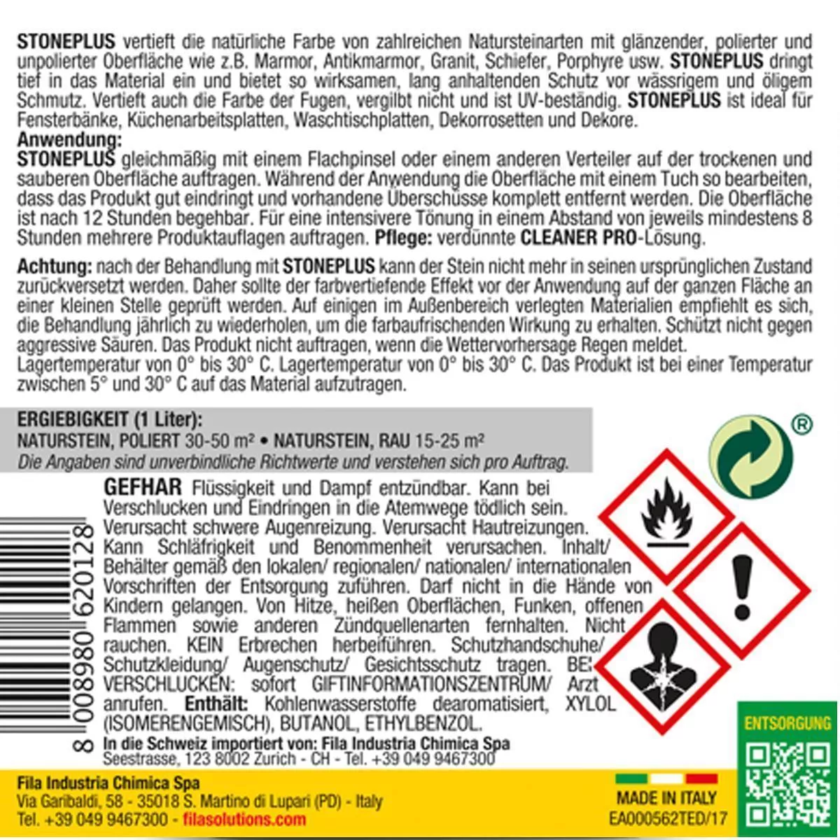 Po ošetření STONE PLUS již nelze kámen vrátit do původního stavu. Proto je třeba efekt prohloubení barvy vyzkoušet na malé ploše před použitím na celou plochu. U některých materiálů položených venku se doporučuje ošetření každoročně opakovat, aby se zachoval efekt osvěžení barvy. Nechrání před agresivními kyselinami. Neaplikujte přípravek, pokud předpověď počasí hlásí déšť.
