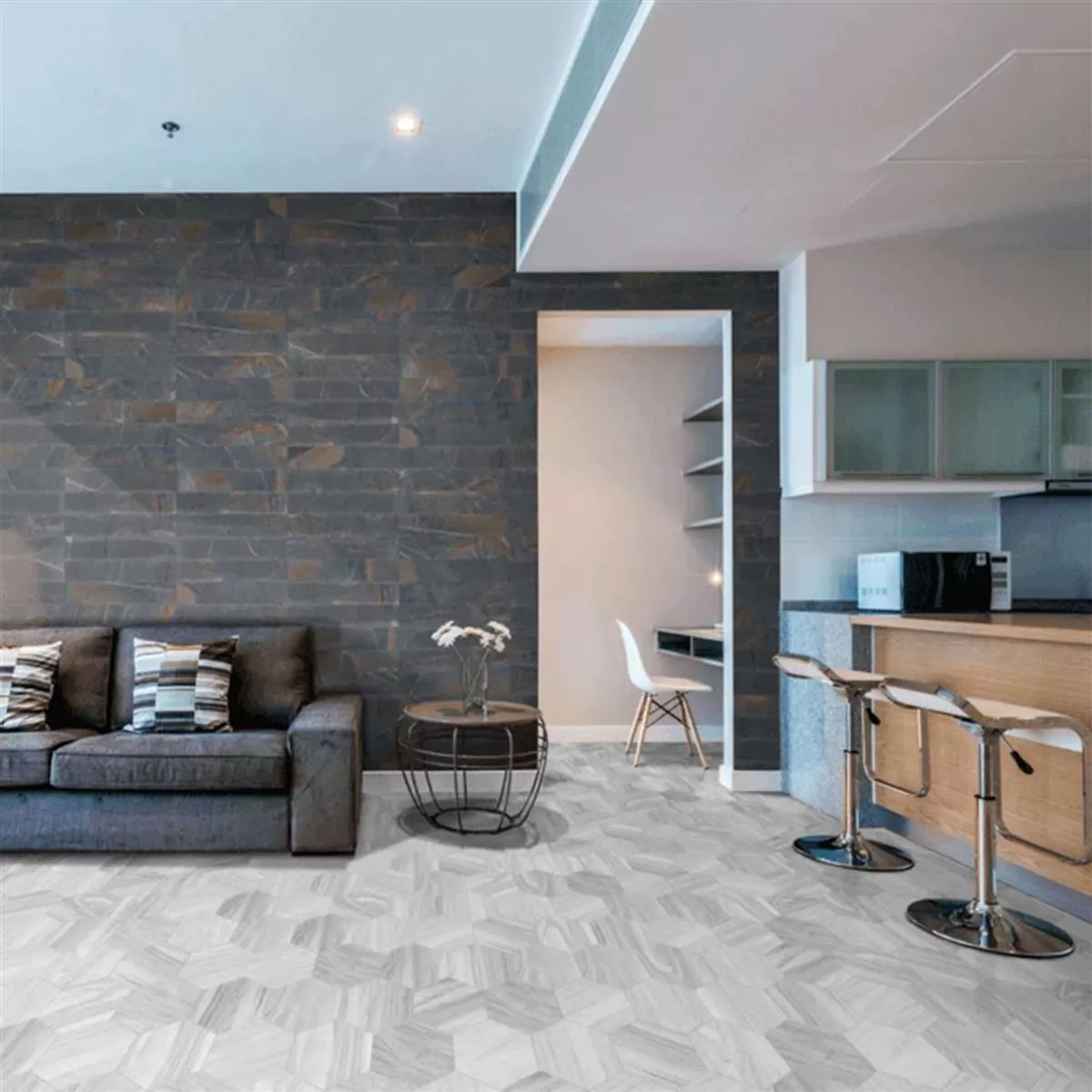 Dejte svým pokojům nový vzhled a vytvořte si příjemnou atmosféru s porcelánovými kameninovými dlaždicemi Hexwood Hexagon Grey.