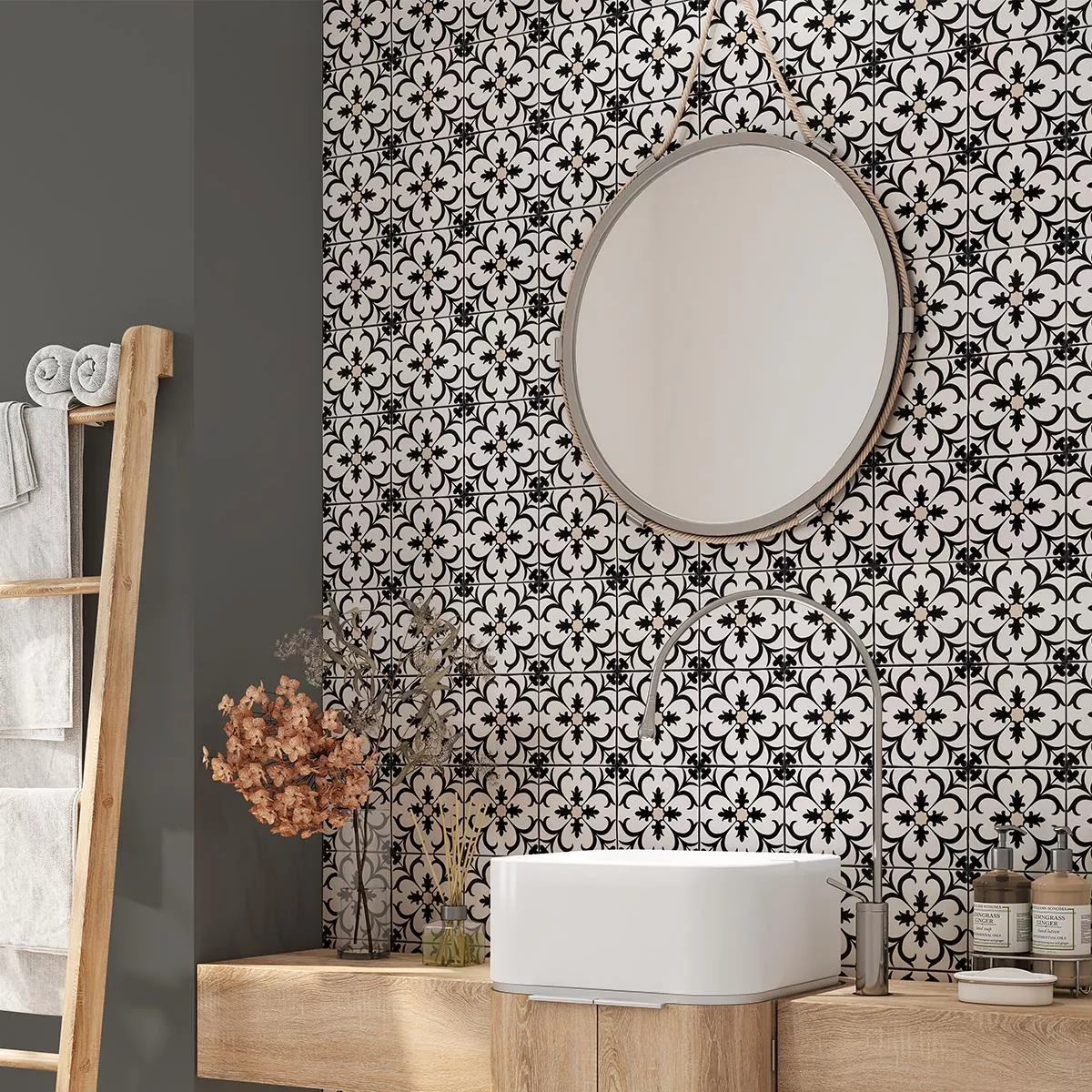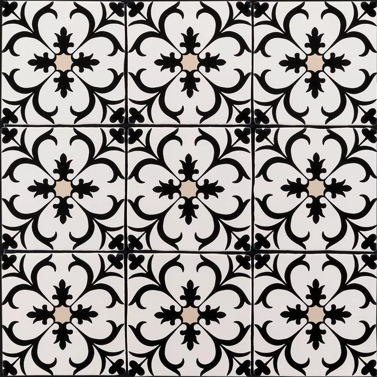 Dlažba Ornamenti Trieste s květinovým vzhledem dodá vašemu interiéru harmonickou kombinaci černé, béžové a bílé. Matný povrch a tloušťka 8 mm jim dodává robustní strukturu.