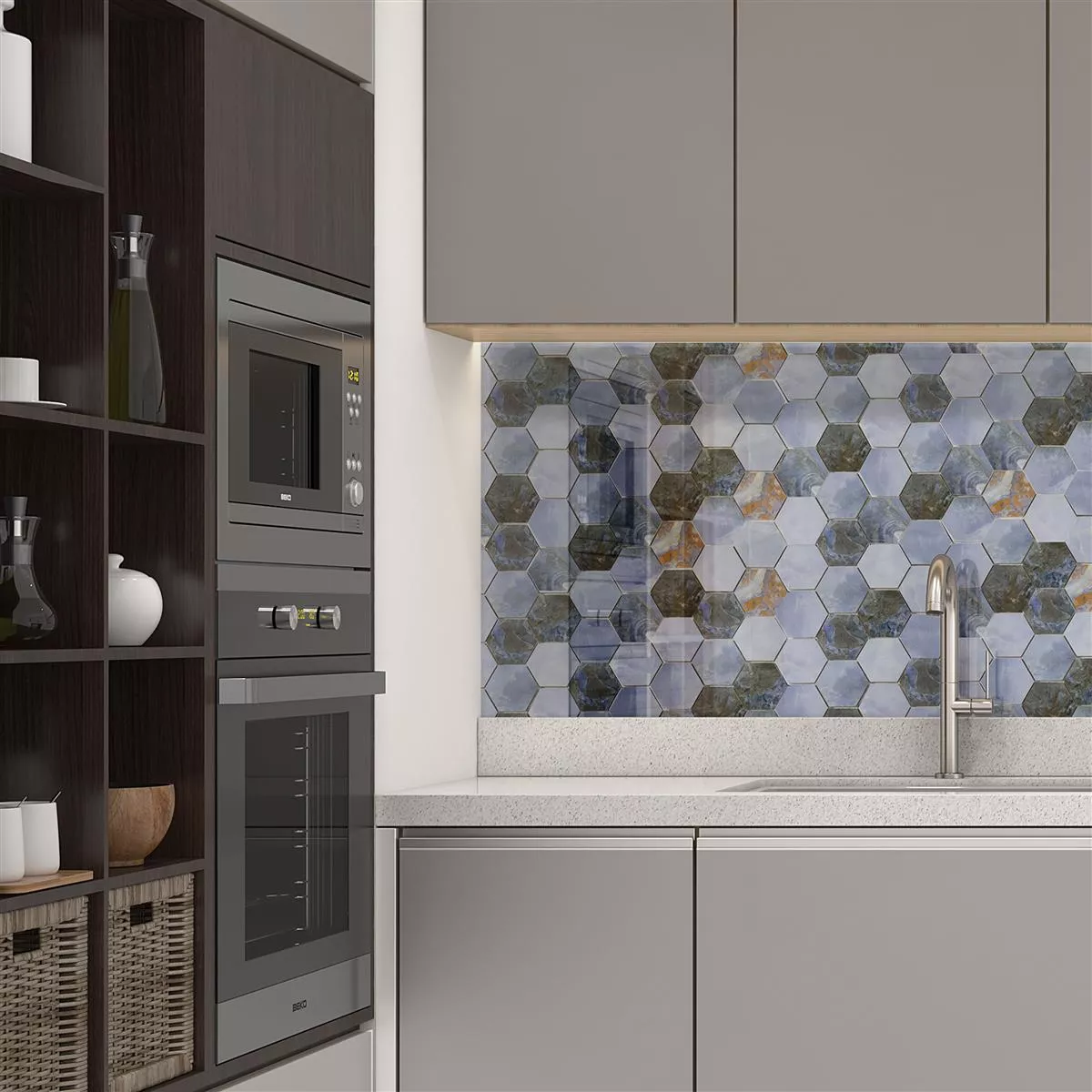 Keramické mozaikové obklady v elegantní barevné kombinaci modré a černé ztělesňují nadčasové spojení stylu a sofistikovanosti. Tyto dlaždice vyrobené z vysoce kvalitní porcelánové kameniny s leštěným povrchem představují nejen estetický vzhled, ale také pozoruhodnou robustnost.