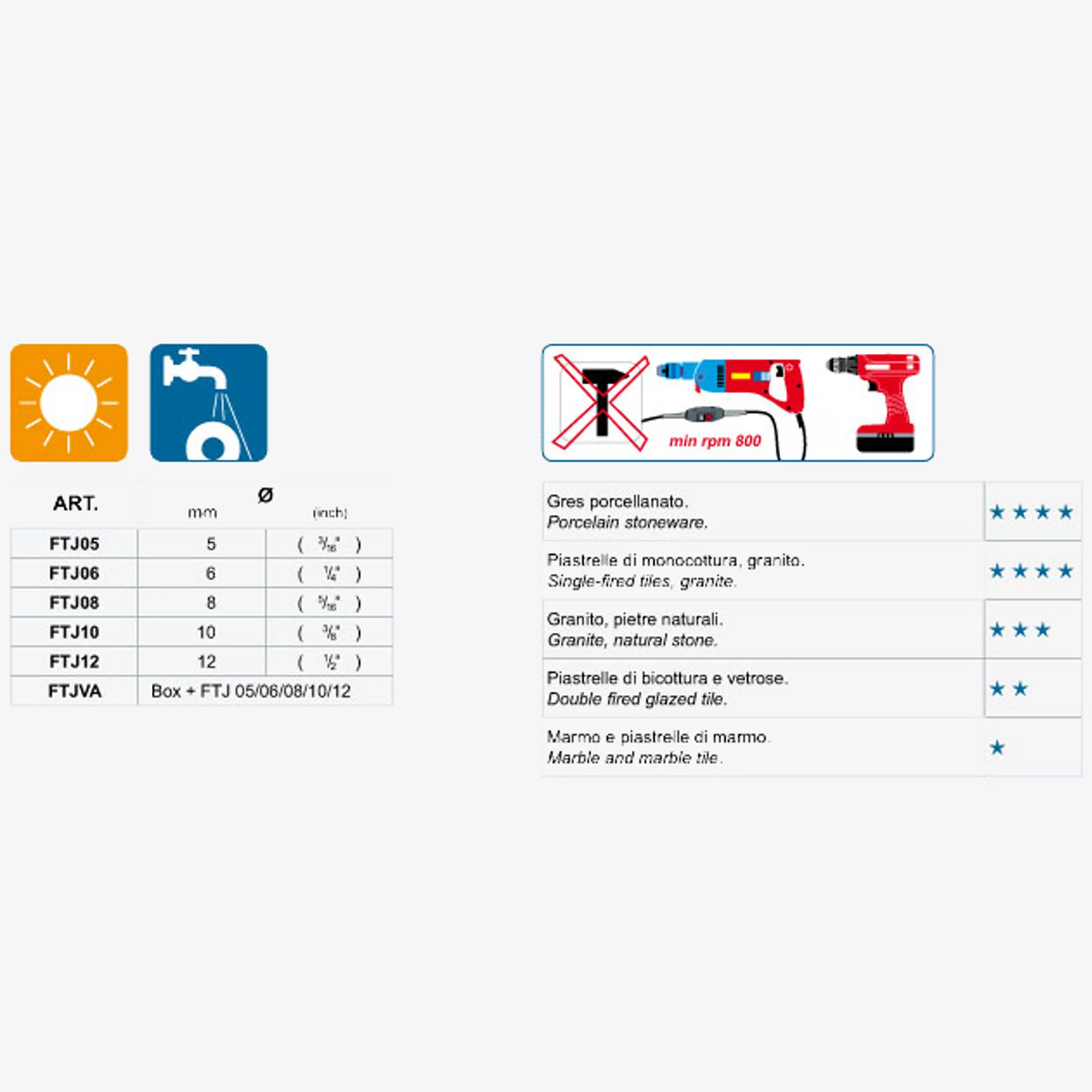 Vrták s diamantem je vhodný pro vrtačku s 800 otáčkami za minutu a více. Korunka není použitelná při nižších rychlostech. Zajišťuje čistý řez a snaží se zabránit prasklinám v dlaždicích. Každá velikost je k dispozici samostatně. Aby se dal snadno odlišit od ostatních výrobců, byl natřen zelenou barvou. Jednotlivé velikosti jsou průměry 5 mm, 6 mm, 8 mm, 10 mm a 12 mm. Pro dosažení nejlepších výsledků se doporučuje povrchy předem otřít. Obklady lze zpracovávat jak jednotlivě, tak instalovat na stěnu. Přidání malého množství vody do vrtáku zabrání přehřátí. Diamant je trvanlivý a dá se velmi dobře mnohokrát použít.
