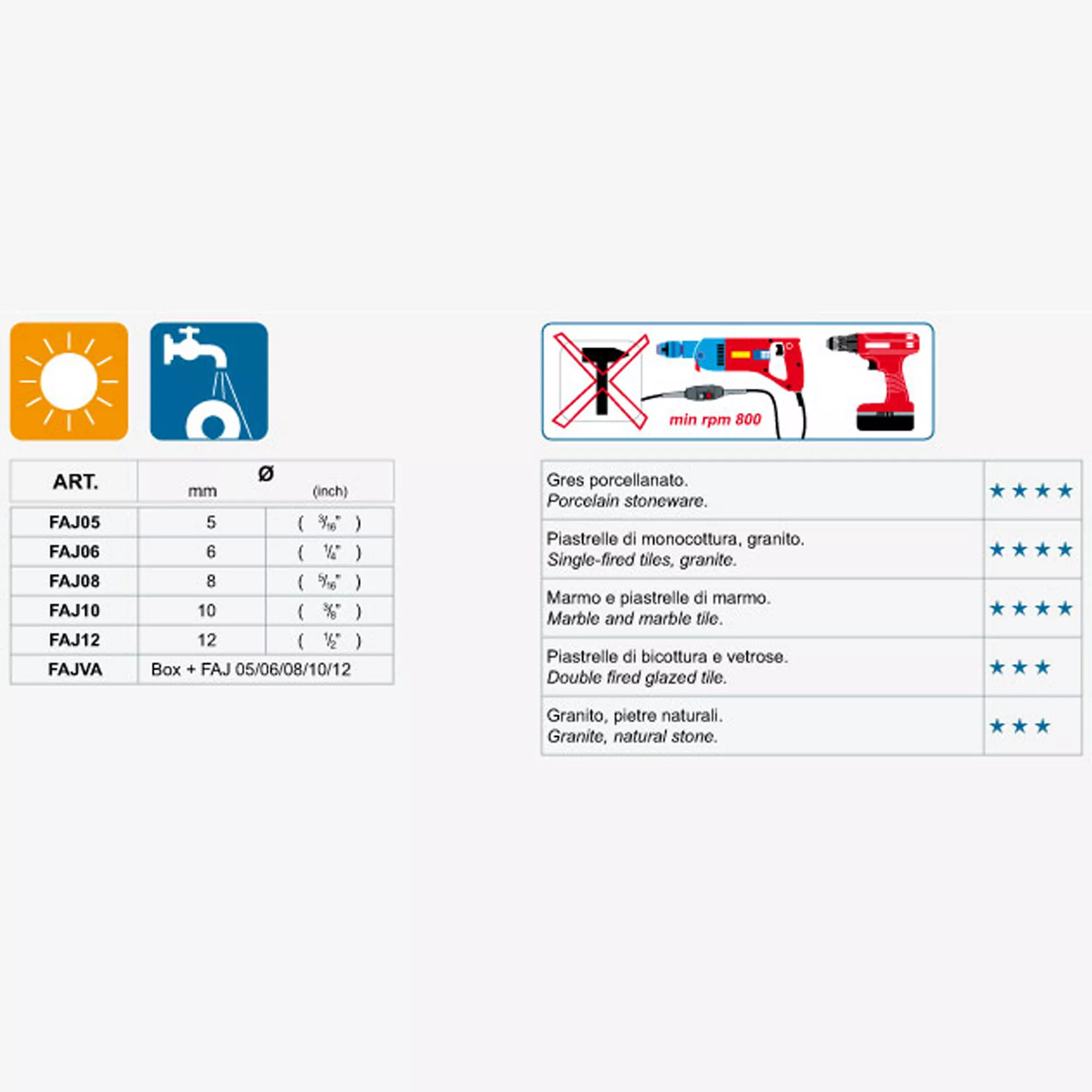 Chcete-li použít diamantovou korunku, potřebujete vrták s otáčkami alespoň 800 ot./min. Diamantový vrták Mondrillo je k dispozici v 5 různých velikostech. Zákazník si může vybrat mezi průměry 5, 6, 8, 10 a 12 mm. Diamantové nástroje, jako je tento, jsou považovány za obzvláště tvrdé a jsou určeny pro širokou škálu prací. Zatímco tento diamantový nástroj je vhodný pro suché vrtání, existují i jiné nástroje, které lze použít pro mokré vrtání. Při nákupu vrtáku a diamantového nástroje byste měli dbát na vysokou kvalitu a bezchybné zpracování. Zde prezentovaný nástroj by měl být provozován s vhodnou nebo kompatibilní vrtačkou.