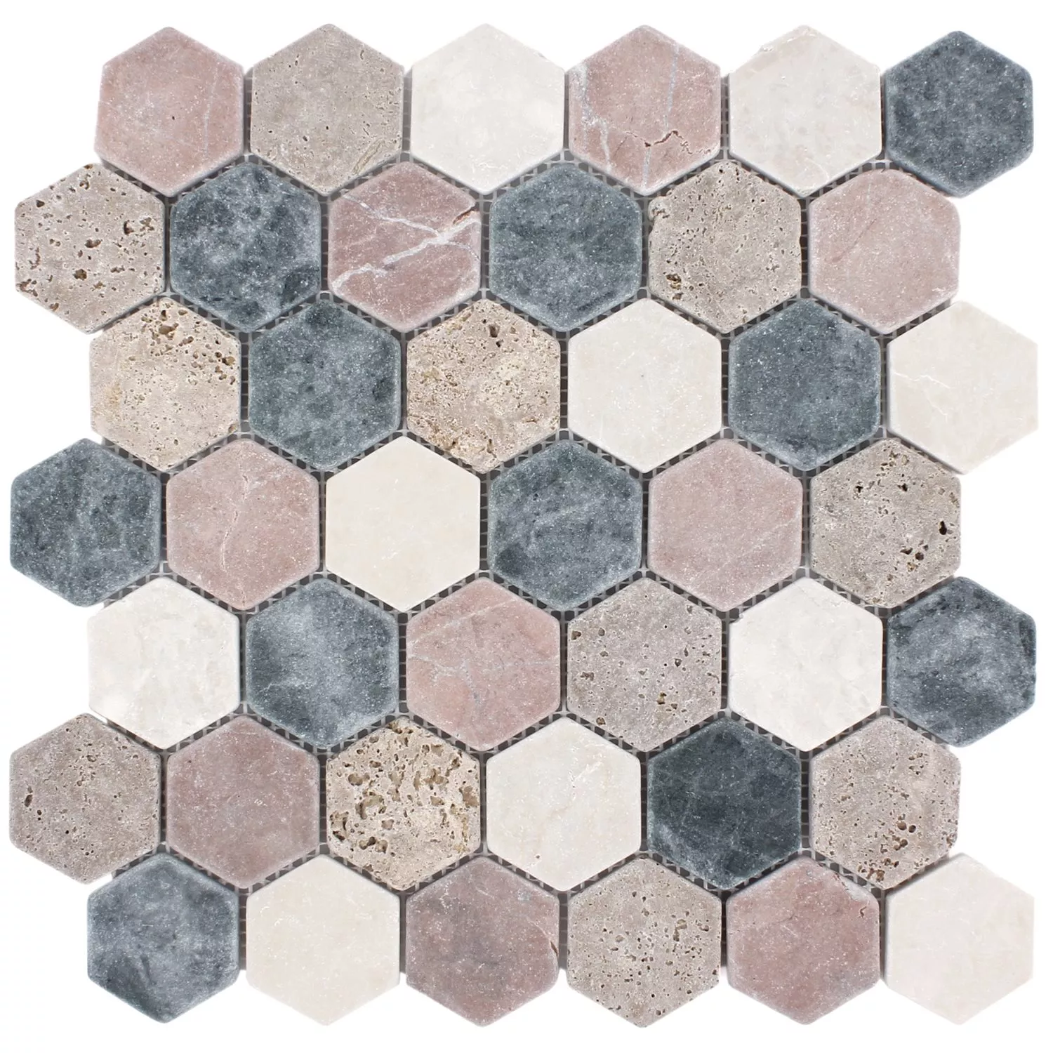 Mozaika této dlaždice Tarsus Bunt z přírodního kamene se skládá z mramorových kamínků ve tvaru šestiúhelníku. Jsou k dispozici ve čtyřech různých vzorech povrchu, které lze snadno vzájemně kombinovat. Výsledkem jsou možnosti designu, které dodají vašemu bytu velmi osobní nádech.
