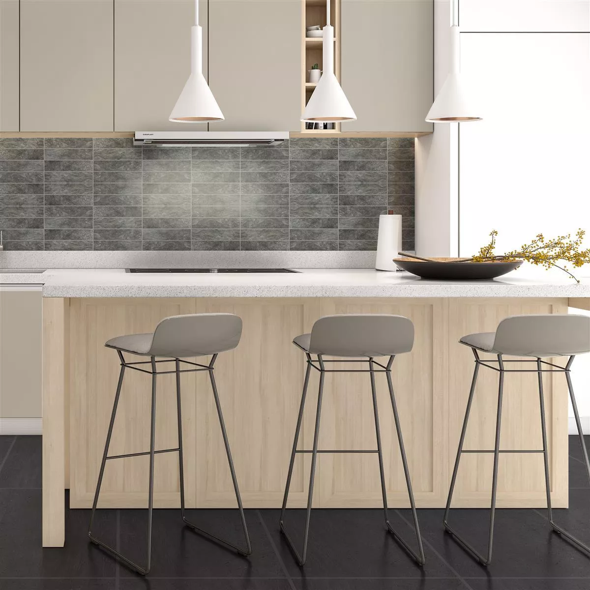 Antracitová barva dodává obkladům elegantní a nadčasovou estetiku. Matný povrch zajišťuje příjemný pocit a zároveň zabraňuje vzniku odlesků či odrazů. Vlnitý a strukturovaný povrch také dodává dlaždicím zajímavou texturu, která zvláštním způsobem zachycuje světlo a vytváří jedinečný vizuální dojem.