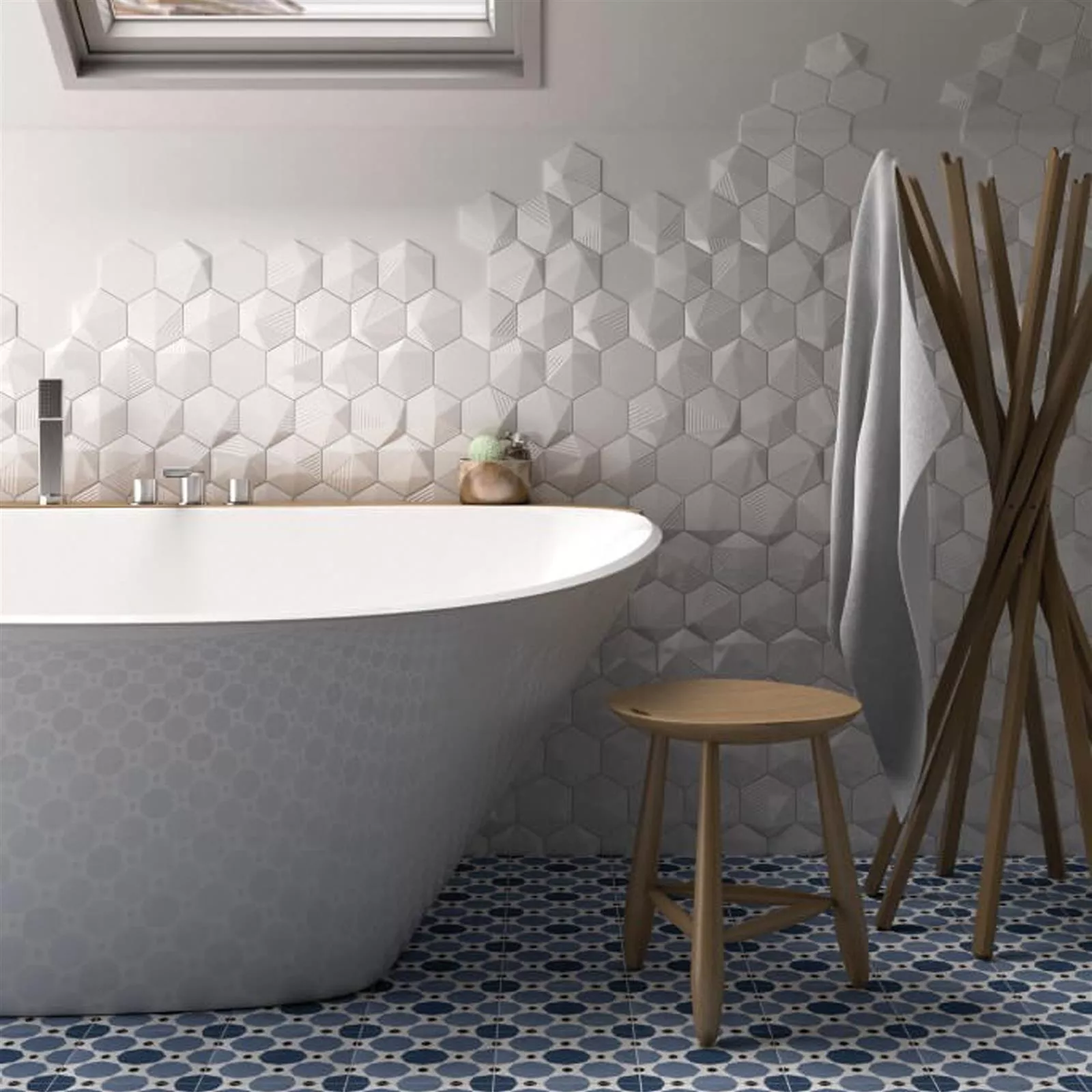 Poutavý obklad v chladných tónech se skvěle hodí k modernímu stylu bydlení ve všech interiérech. Vyzařuje avantgardní kouzlo a má vysokou dekorativní hodnotu. S přirozeným nebo cíleným osvětlením lze 3D tvar obkladu využít nejen k vytvoření okouzlujících akcentů v koupelně a kuchyni. Každá jednotlivá dlaždice je již uměleckým dílem, takže nabízí prostor pro nekonečně kreativní přání ve všech oblastech obývacího pokoje, takže i nenápadný výklenek se stane skutečným poutačem.