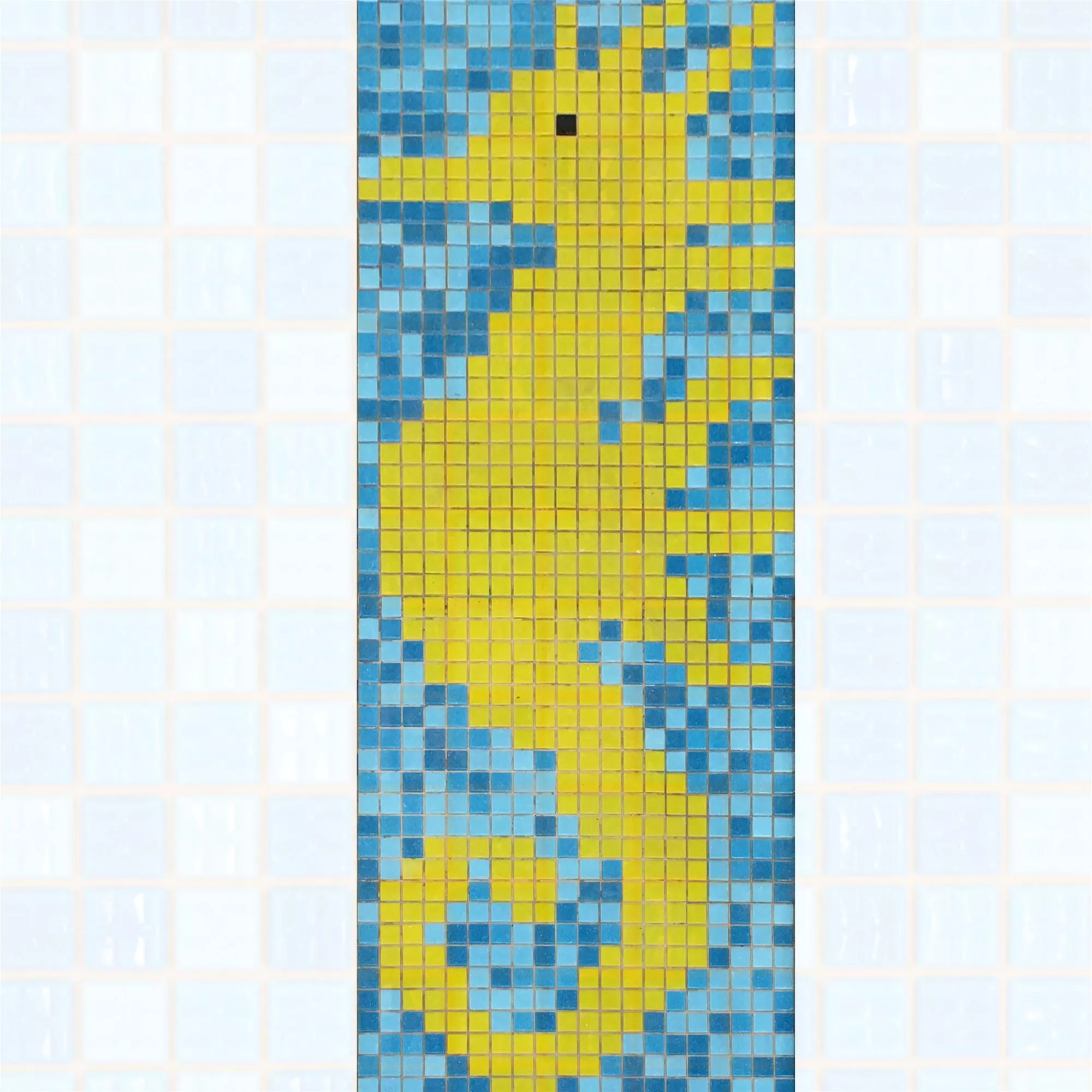 Tato světle modrá mozaika se žlutými mořskými koňmi je úžasným detailem pro vnitřní i venkovní použití, ale také pro mokré oblasti. Díky velmi robustnímu použitému sklu je možné tuto mozaiku použít také v plaveckých prostorách, jako je bazén nebo dokonce v bazénech. Různé modré tóny a matný vzhled ukazují detailní práci.