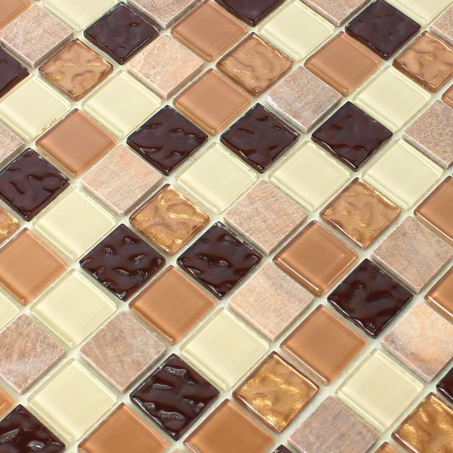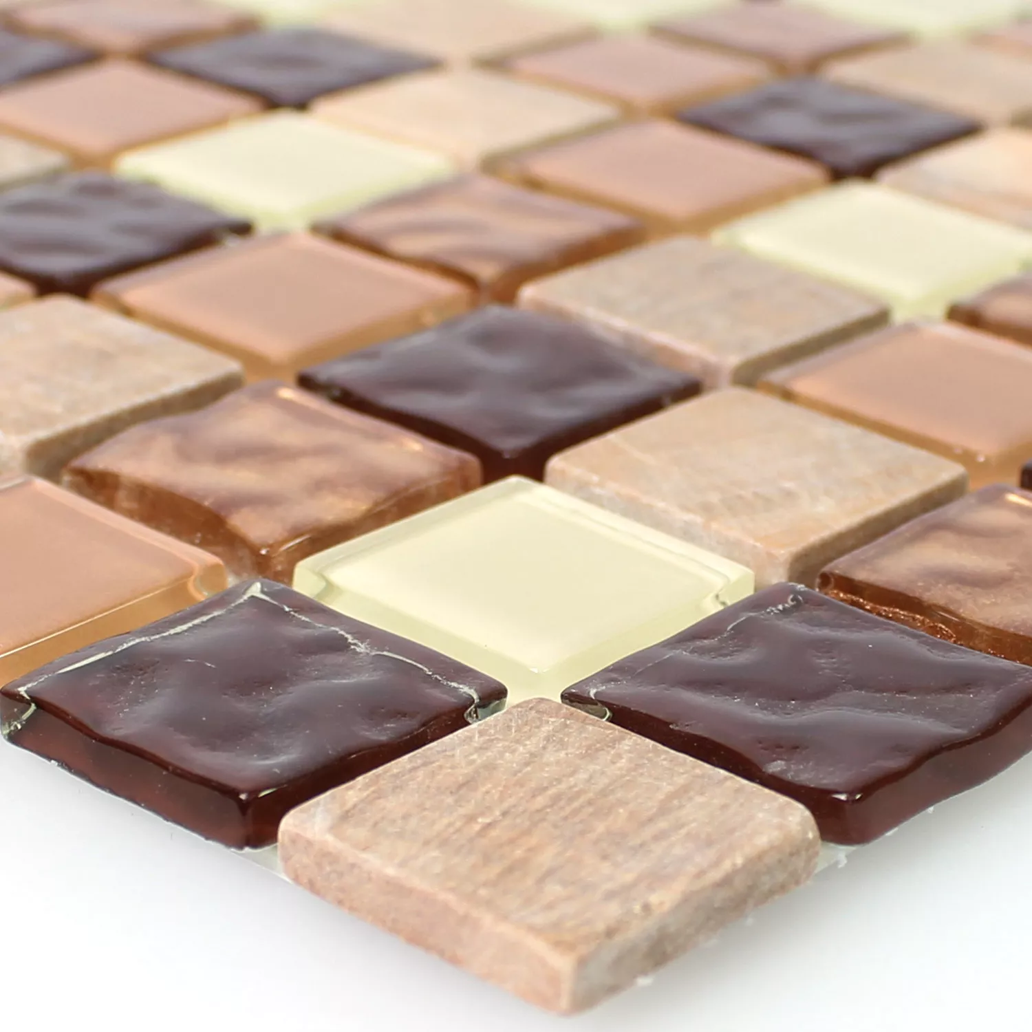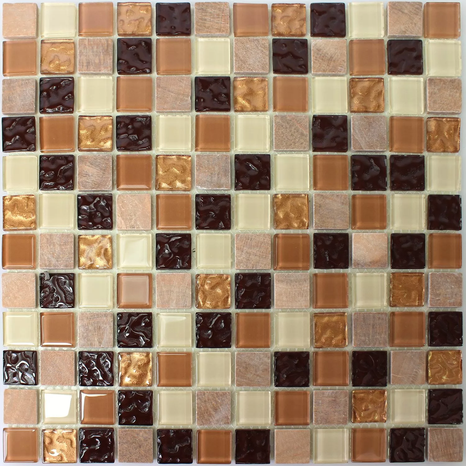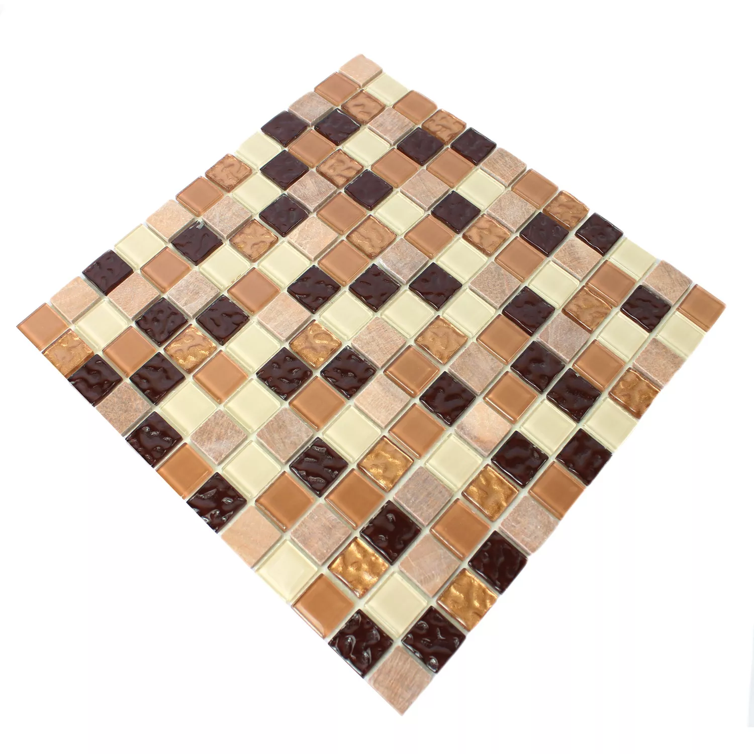 Mozaikové dlaždice „Karaman“ spojují stylovou estetiku s praktickou funkčností. Je zařízen v elegantních barvách hnědé a béžové a skládá se z atraktivní směsi přírodního kamene a skla. Dlaždice jsou ideální pro design stěn v interiérech, jako je kuchyně nebo obývací pokoj.