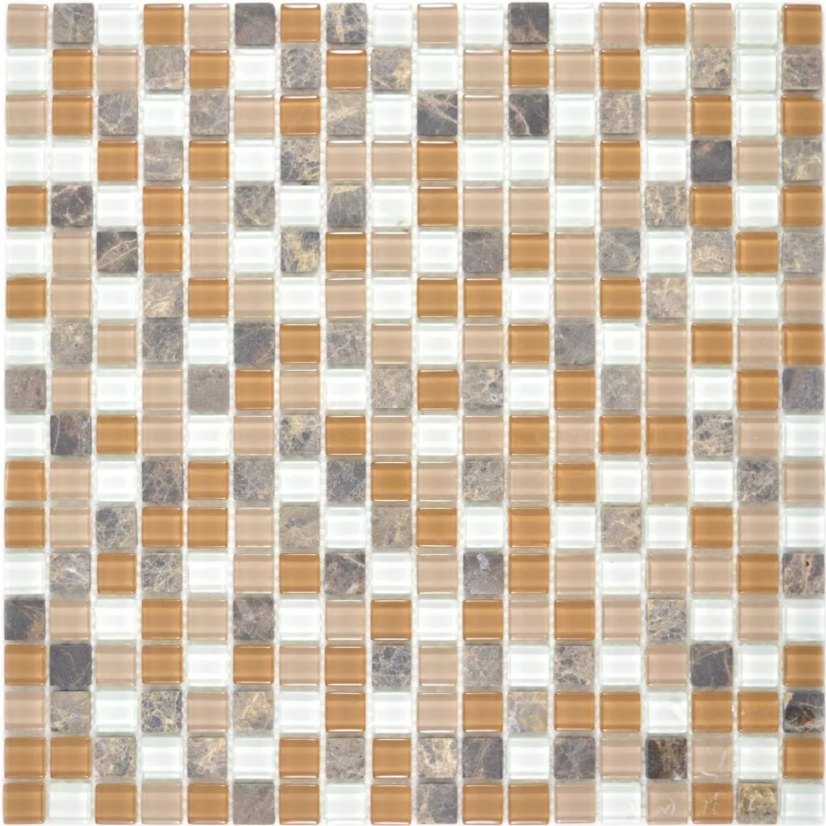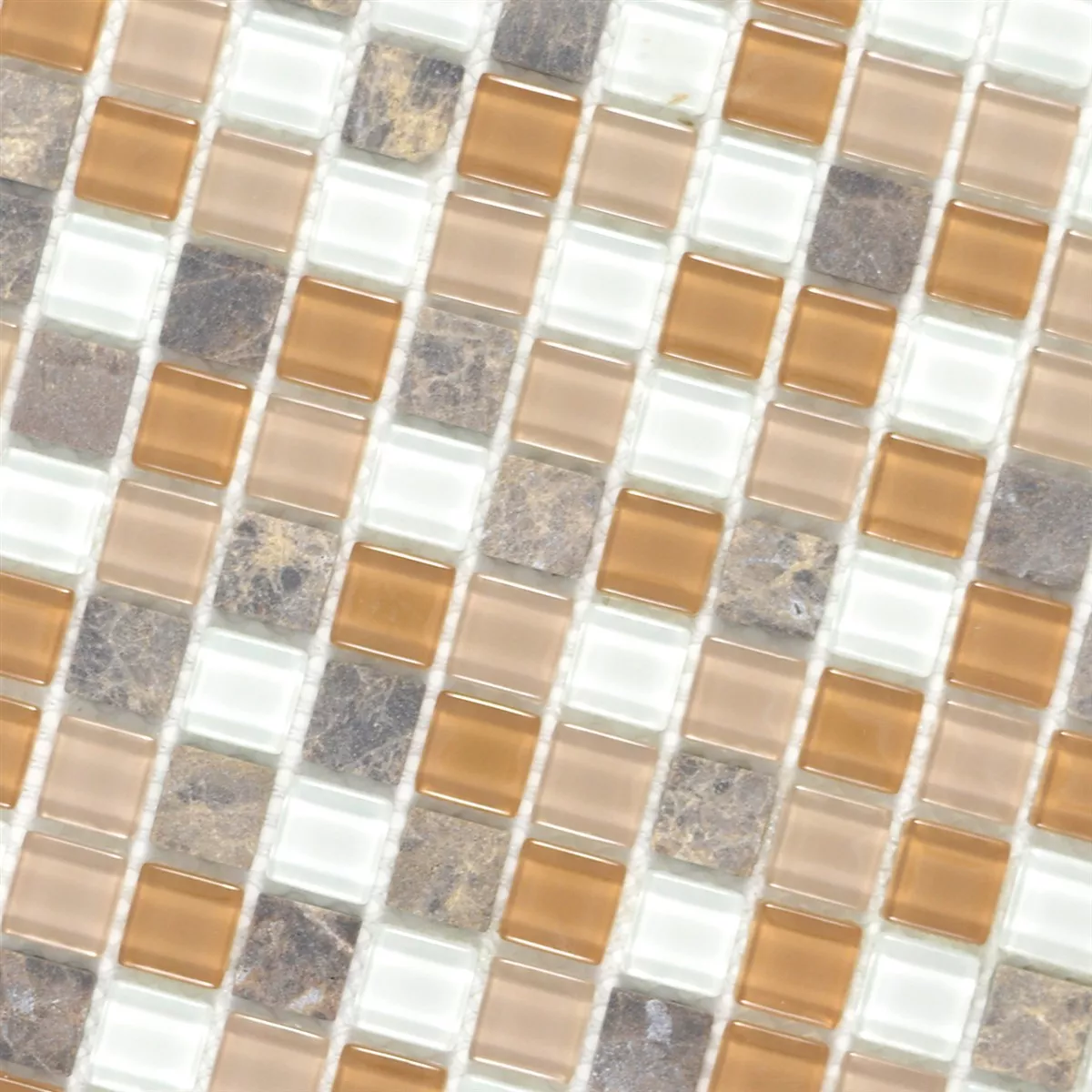 Skleněná mozaika z přírodního kamene Zekova v barevné variantě béžová hnědá bílá se skládá střídavě z mramoru a skla. Skleněná mozaika z přírodního kamene Zekova má rozměr kamene 15 x 15 mm. Dále mají kameny střídavě matný a lesklý povrch.