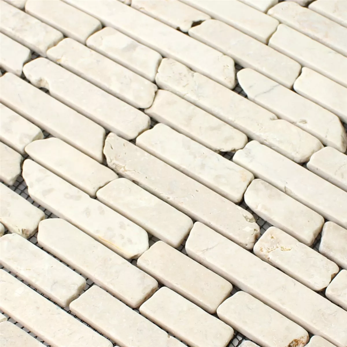 Tyto béžové mramorové dlaždice jsou ideální pro vnitřní i venkovní prostory, jako jsou koupelny, kuchyně a chodby. Jsou mrazuvzdorné, voděodolné a protiskluzové. S matným povrchem a třídou oděru 4 nabízejí odolnost a robustnost. Rozměry kamene 15x25 mm a 15x105 mm jsou již namontovány na síti, což usnadňuje instalaci. Šířka spáry je 3 mm.