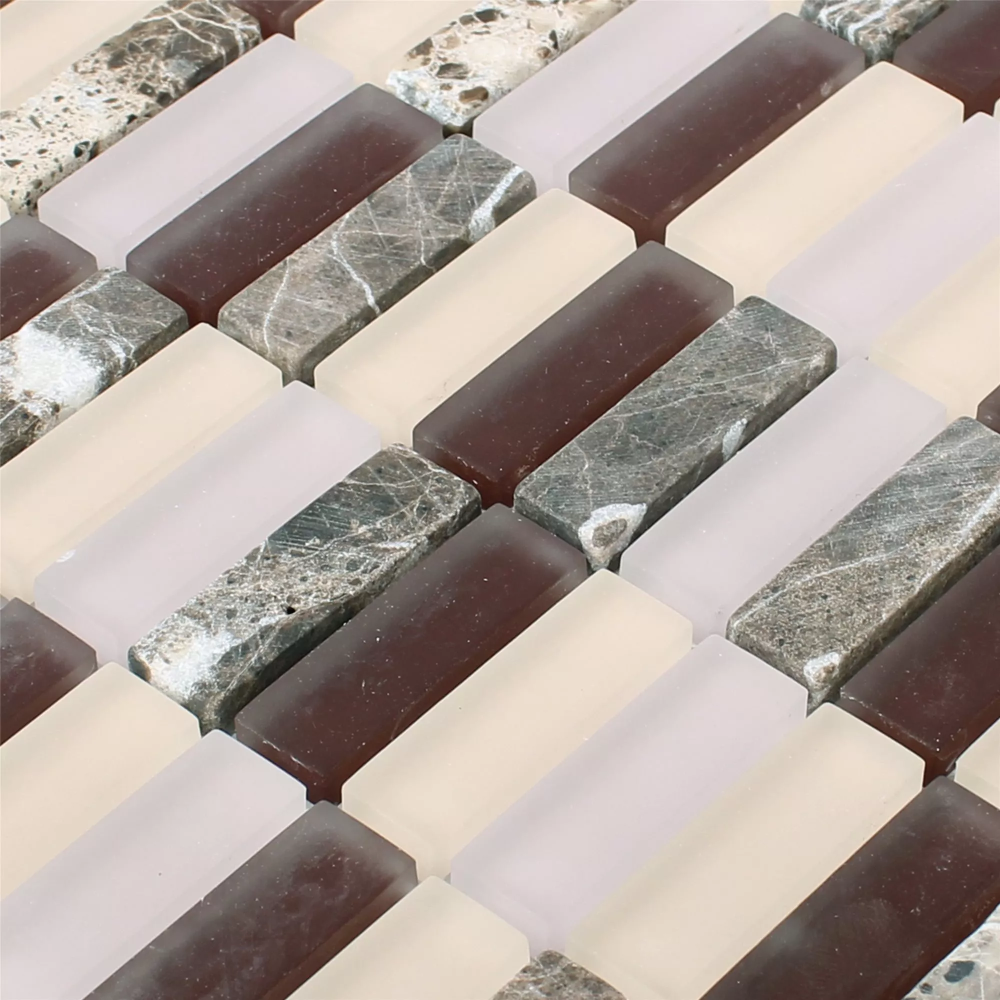 Skleněná mozaika z přírodního kamene Conrad má kameny v barvách fialové, hnědé, béžové a vínové. Velikost kamene je 15 x 50 mm. Výrobek se skládá z fascinující kombinace materiálů skla a přírodního kamene. Kameny o tloušťce 8 mm jsou připevněny k podložce o rozměrech 30 x 30 cm, takže se snadno a pohodlně pokládají.